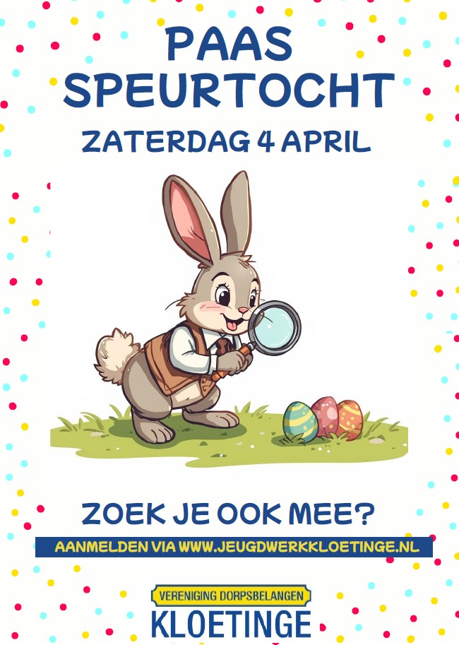 Op zaterdag 4 april kunnen alle kinderen uit Kloetinge gaan speuren in hun wijk. In zowel ‘oud’ Kloetinge, de Riethoek als het Oostmolenpark zetten we een leuke speurtocht uit.